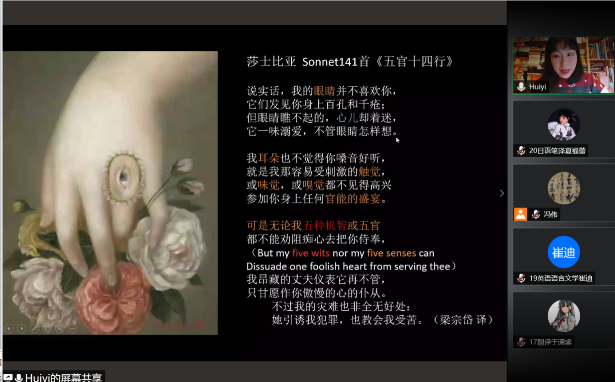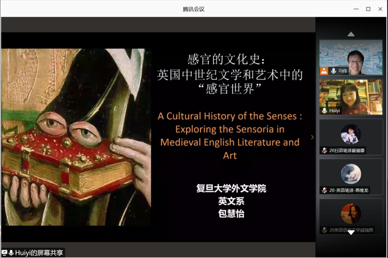 11月23日晚,“15vip太阳集团九十周年院庆系列活动”——线上学术报告顺利举办。复旦大学包慧怡副教授做客15vip太阳集团“文渊论坛”,本次讲座以“感官的文化史:英国中世纪文学和艺术中的‘感官世界’”为题,15vip太阳集团冯伟副教授主持了此次讲座,来自校内外的240余名师生参与聆听。