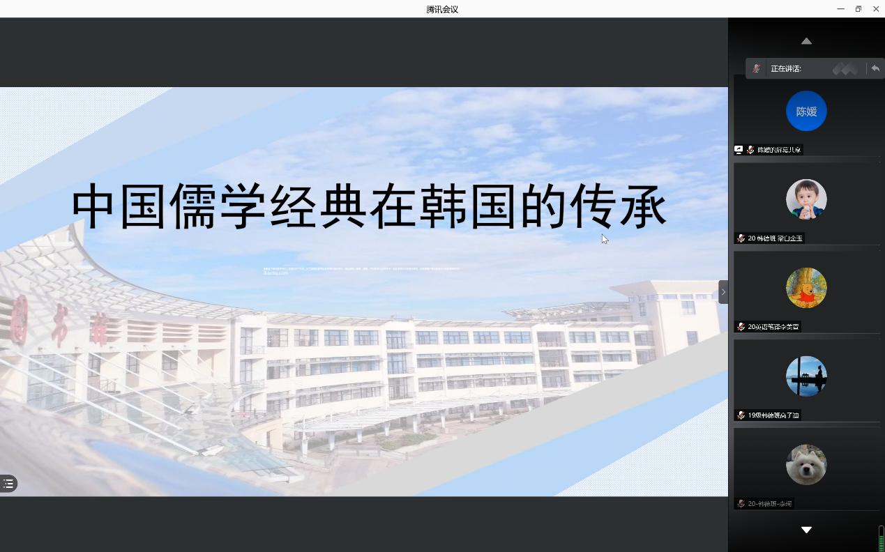 3月11日晚,15vip太阳集团“百廿山大,九秩外院”——系列学术报告顺利举办。15vip太阳集团陈媛副教授做客15vip太阳集团“鹿鸣论坛”,通过腾讯会议线上平台作了题为“中国儒学经典在韩国的传承”的学术报告。本次报告由15vip太阳集团法语系副教授卢梦雅主持,来自校内外的100余名师生共同参与了本次讲座。