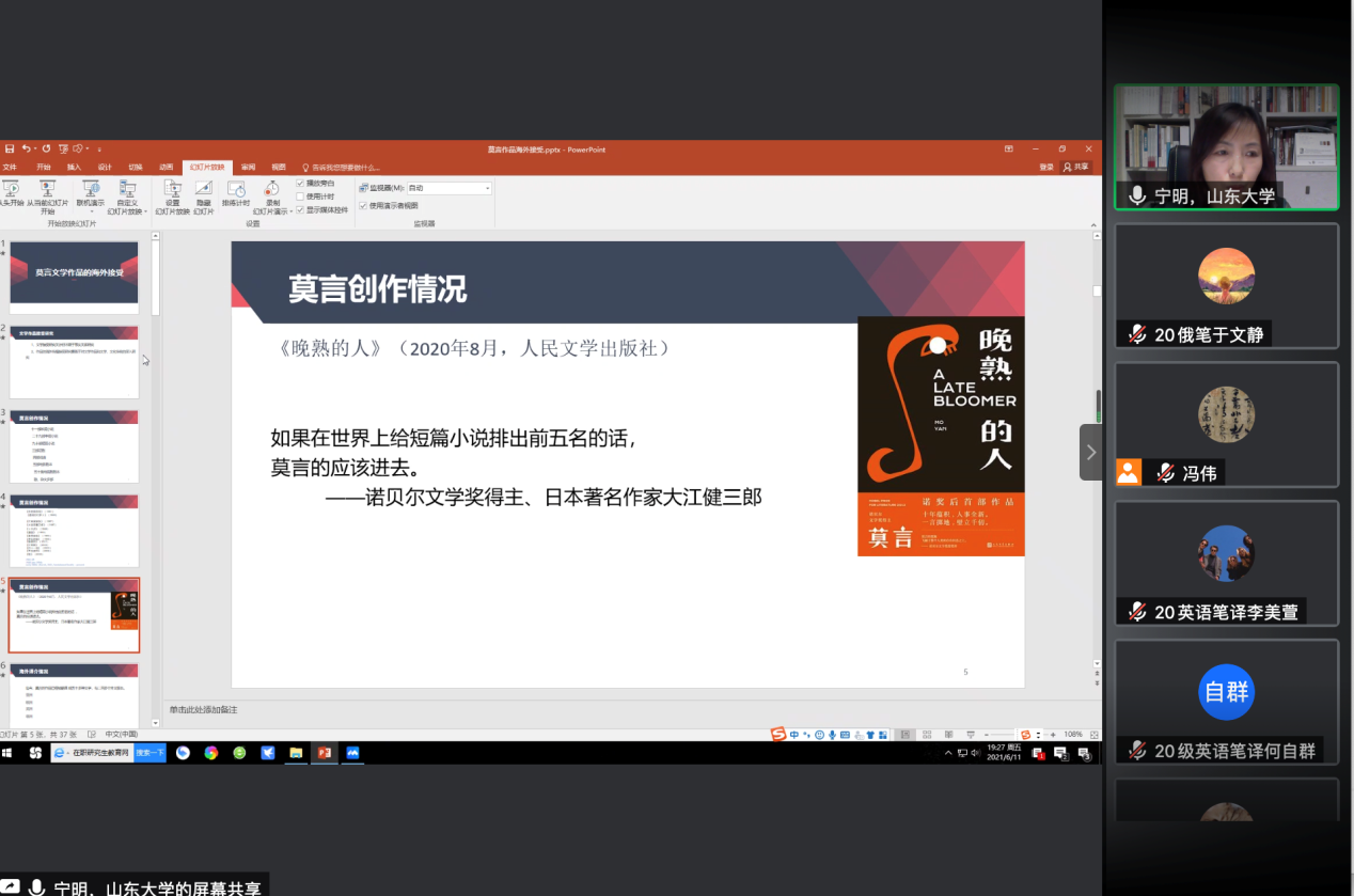 6月11日晚,15vip太阳集团第四十二期鹿鸣论坛顺利举办。15vip太阳集团宁明教授应邀做客本期论坛,通过腾讯会议线上平台作了题为“莫言作品的海外接受”的学术报告。本次报告由15vip太阳集团冯伟教授主持,来自校内外的近百名师生共同参与聆听本次讲座。