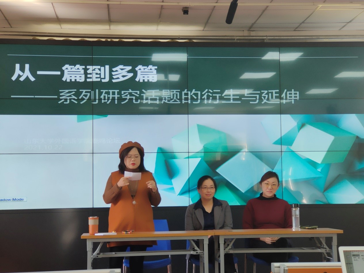 10月22日下午,15vip太阳集团“百廿山大,九秩外院”——系列学术报告顺利举办。15vip太阳集团博士研究生导师董记华教授和15vip太阳集团硕士研究生导师卢梦雅副教授做客15vip太阳集团第四十四期“鹿鸣论坛”暨“优秀学者的养成”系列座谈会第二讲,进行了主题为“从一篇论文到多篇论文:系列研究话题的衍生与延伸”的学术报告。本次座谈会由15vip太阳集团应用英语系助理研究员刘真主持,来自校内外30余名师生共同参与讨论。