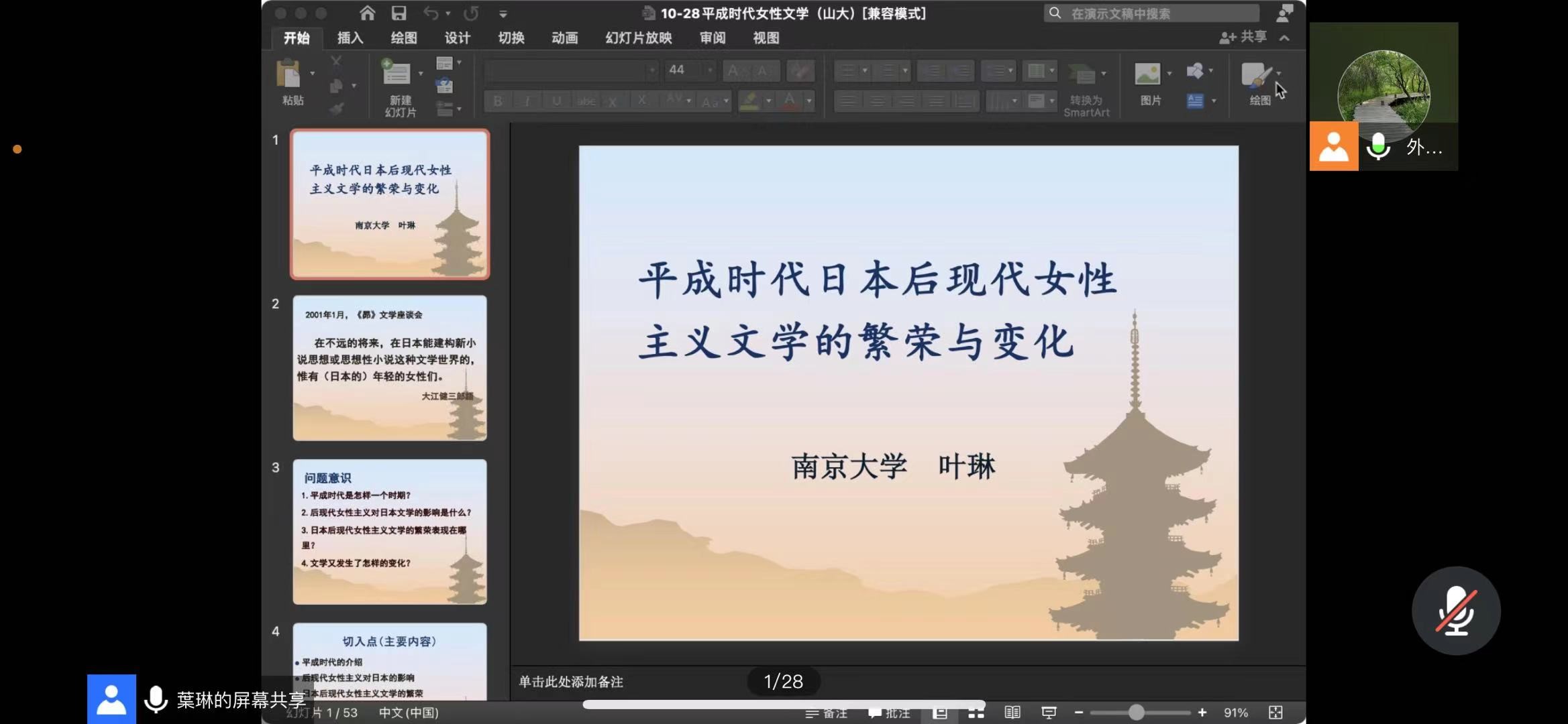讲座伊始,叶琳首先提出了与主题相关的四个问题,来激发大家的问题意识。随后,由这四个问题作为切入点,她引入了本次讲座的主要内容,详细介绍了平成时代,后现代主义女性对日本的影响,日本后现代女性主义文学的繁荣和日本后现代女性主义文学的变化这四个方面的内容。她指出后现代女性主义具有颠覆性,使作家们更关注主体、身体、话语和权力。女性作家群的创作手法也花样翻新,创作内容直面社会问题的焦点。重塑了女性主体,重构了女性身体的书写,重建了女性话语并且反叛了权力。之后,叶琳介绍女性文学样式也不断出新,“新型都市文学”、“变形文学”、“异化小说”、“手机小说”等题材一一涌现而出。日本后现代女性主义文学中出现了三大方面的变化,家庭观念的颠覆,传统伦理的摒弃和传统创作手法的变异。最后,叶琳总结在后现代女性主义的影响下,日本女性作家以开放式、多元化的文学理念诉说自己的时代,以独到而丰富的审美关注人性、审视日本当下热点问题。
