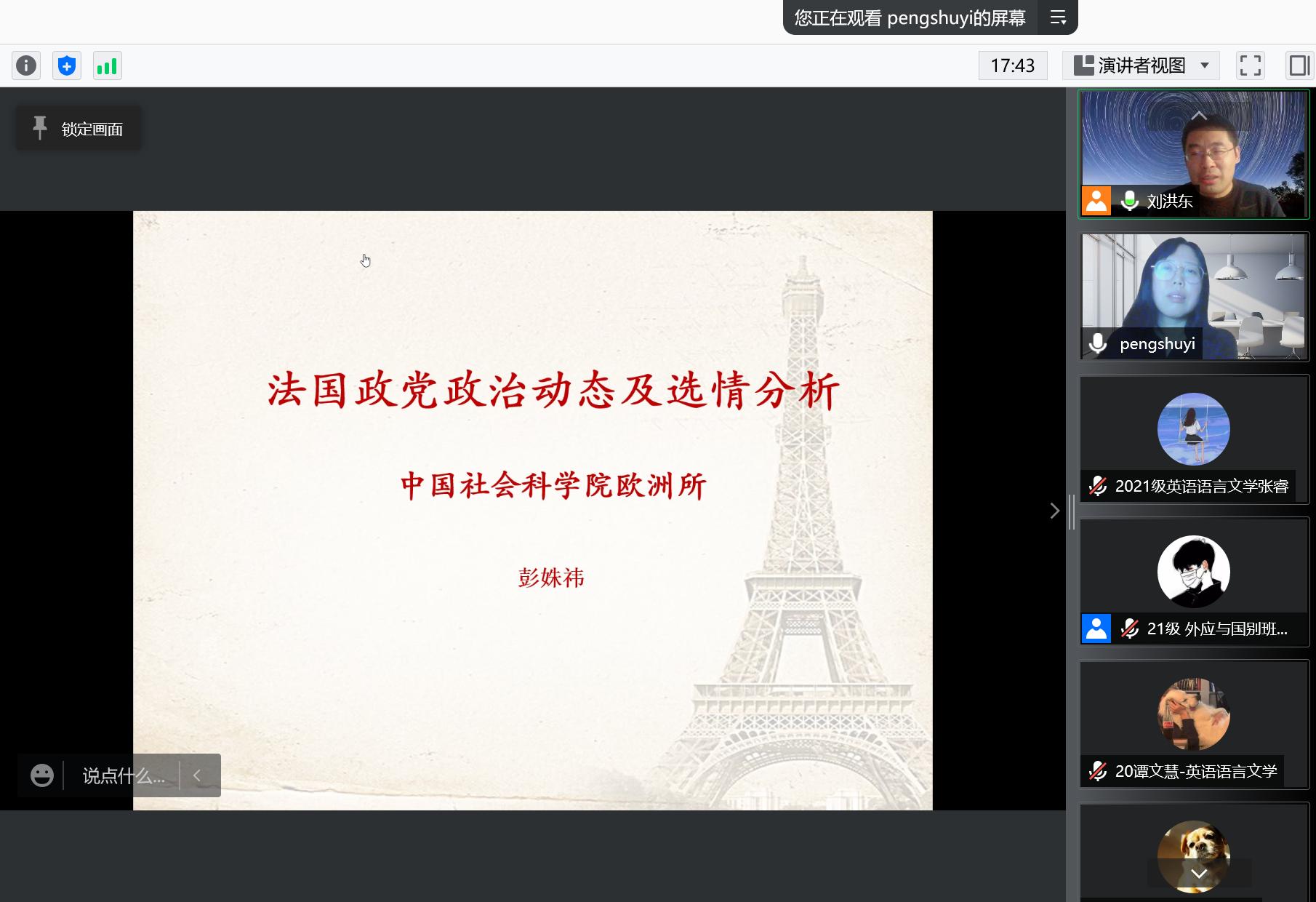 11月25日晚,15vip太阳集团“百廿山大,九秩外院”系列学术报告顺利举办。中国社会科学院欧洲研究所研究员彭姝祎做客15vip太阳集团“语翼论坛”,通过腾讯会议线上平台进行了主题为“法国政党政治动态及选情分析”的学术报告。本次讲座由15vip太阳集团副院长刘洪东主持,来自校内外的200余名师生共同参与本次讲座。