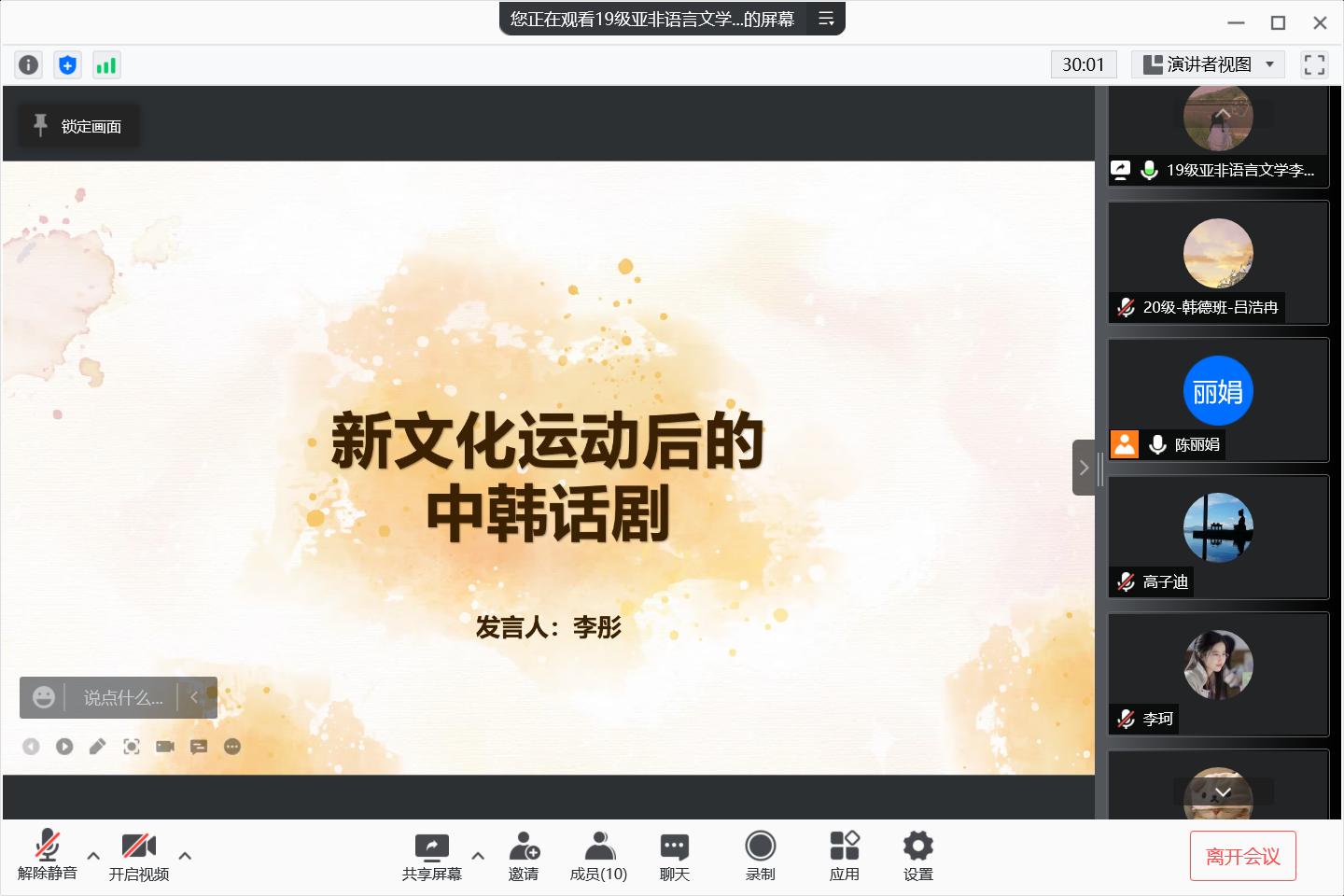 亚非语言文学专业20级博士研究生吴铭以“抗日语境下东亚知识分子的‘三一运动’认识”为主题,系统总结梳理了从1919年三一运动发生到1945年二战结束、朝鲜光复,中国境内的中日韩知识分子对三一运动的认识变化,并进一步探讨了其认知变化产生的原因。亚非语言文学专业19级硕士研究生李彤以“新文化运动后的中韩话剧”为主题,从时代背景、戏剧论争、外国戏剧的译介、戏剧运动、戏剧社团、戏剧文学创作活动等方面分别对新文化运动后的中国话剧和韩国话剧概况进行了梳理与介绍。