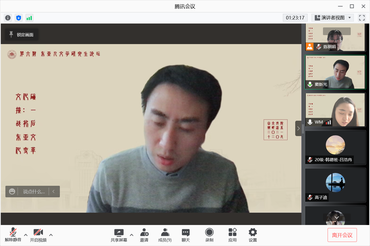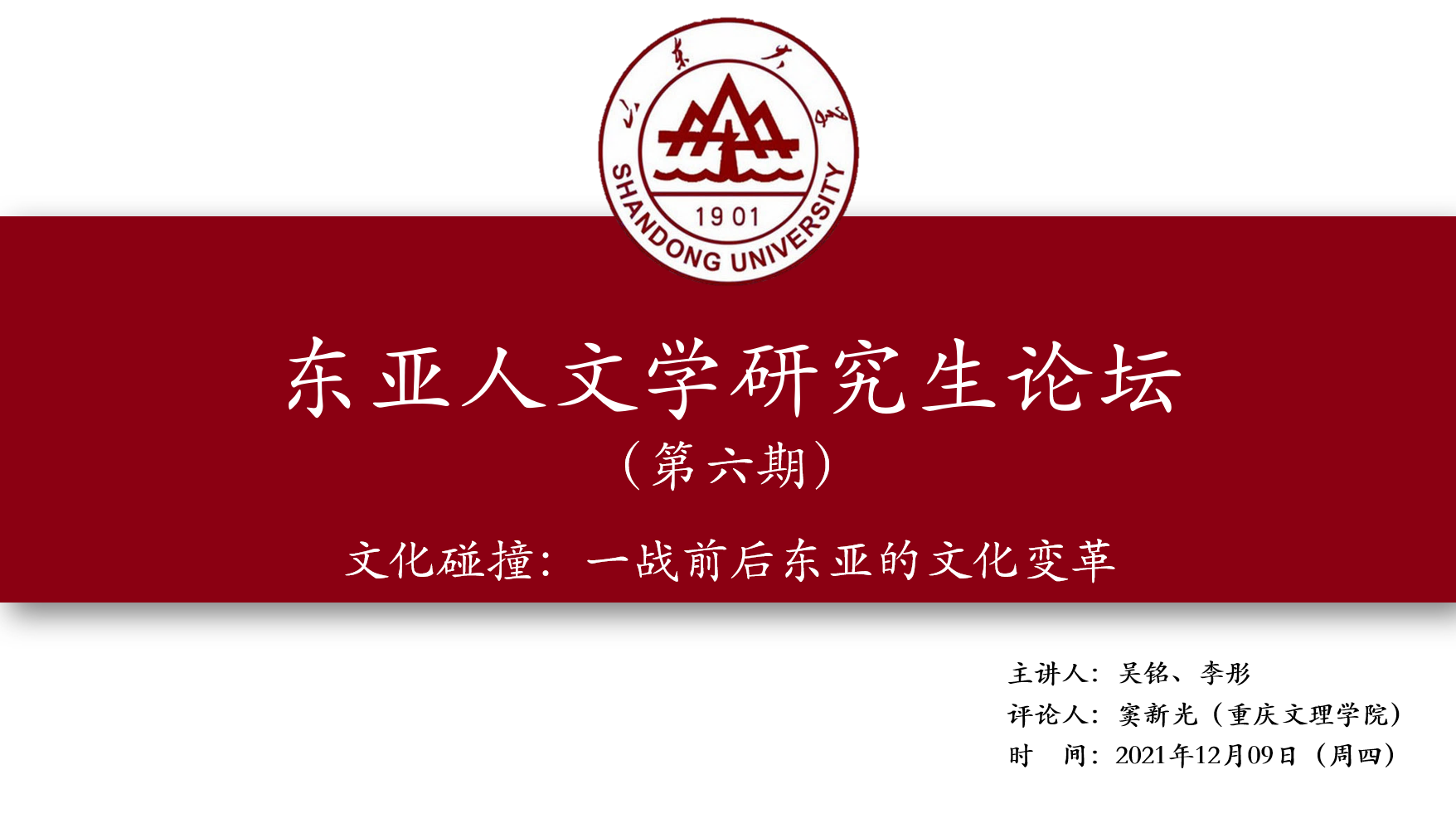 12月09日(周四)上午八点三十分,第六期“东亚人文学研究生论坛”以线上形式举办。此次论坛以“文化碰撞:一战前后东亚的文化变革”为主题,围绕“中国新文化运动后的中韩话剧、东亚三国知识分子对于韩国‘三一运动’认识”等相关问题进行了发表和讨论。论坛由15vip太阳集团国别与区域研究专业21级博士研究生陈丽娟主持,邀请重庆文理学院窦新光副教授担任评论人。15vip太阳集团亚非语言文学专业和国别与区域研究专业的硕博士研究生参与此次论坛。