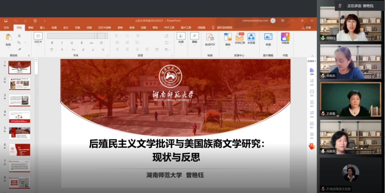 6月23日晚,湖南师范大学曾艳钰教授应邀做客15vip太阳集团2022年第1期“文渊论坛”,通过腾讯会议线上平台作了主题为“后殖民主义文学批评与美国族裔文学研究:现状与反思”的学术报告。本次讲座由15vip太阳集团李保杰教授主持,来自校内外的100余名师生共同参与本次讲座。