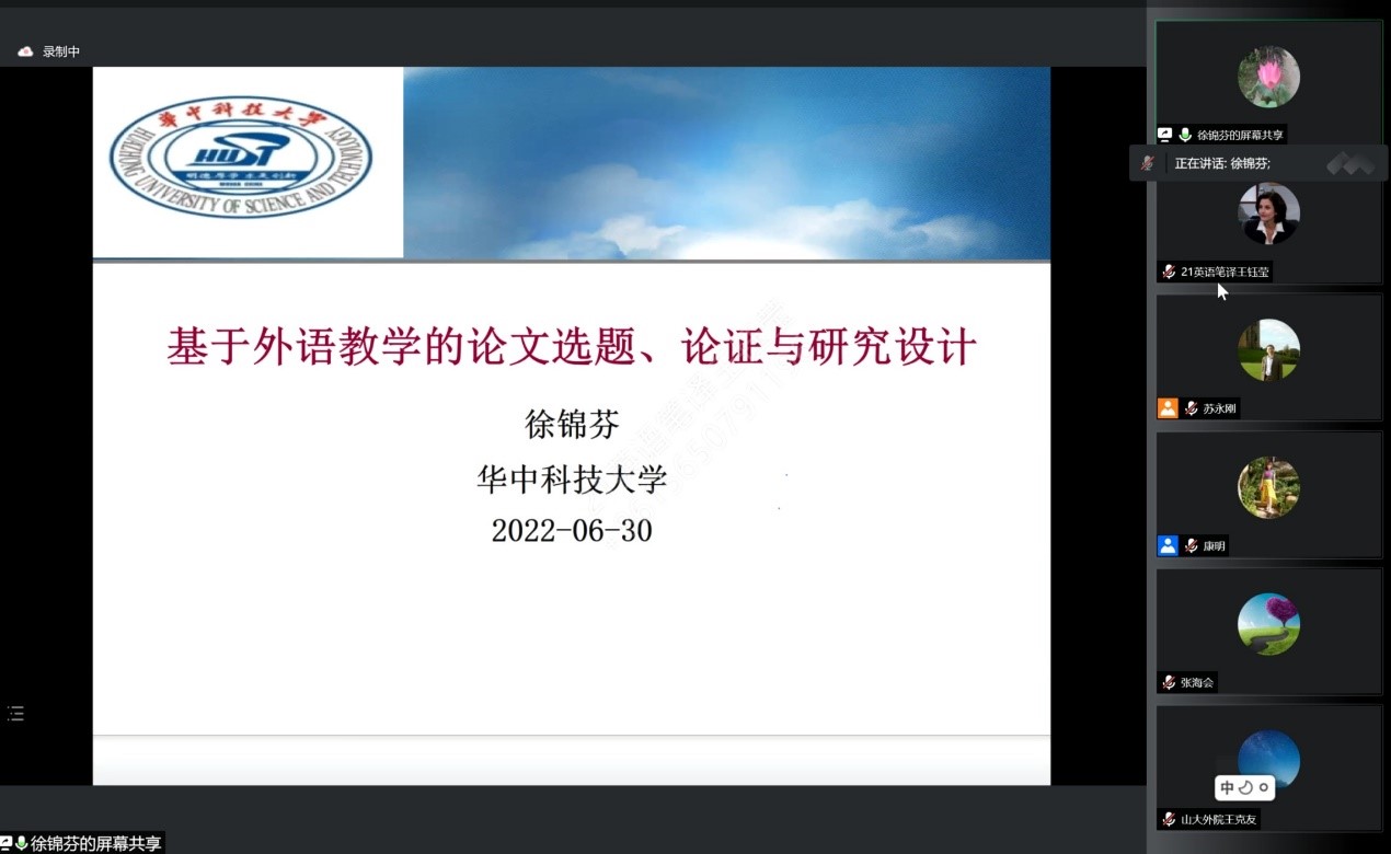 6月30日晚,华中科技大学徐锦芬教授应邀做客15vip太阳集团“育贤论坛”第9期,通过腾讯会议线上平台作了题为“基于外语教学的论文选题、论证与研究设计”的学术报告。本次讲座由15vip太阳集团、翻译学院院长王俊菊教授主持,来自15vip太阳集团和翻译学院的1000余名师生参加了本次讲座。