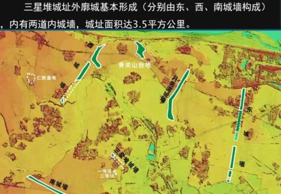 第一部分,重点介绍三星堆的发现与挖掘史,其中包括:1929年春偶然发现、1986年考古大发现、2020-2021年考古新发现。通过展示现场图片、地图说明三星堆城址外廓城的基本形成。
