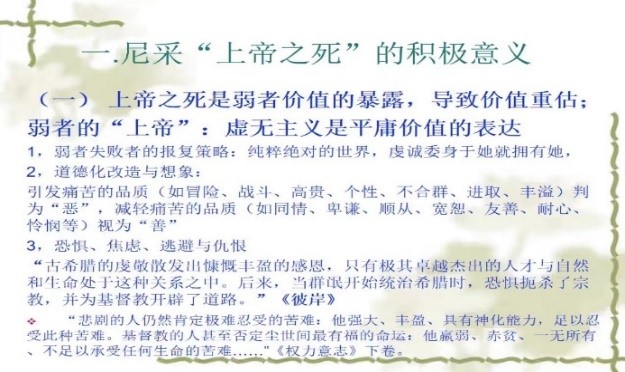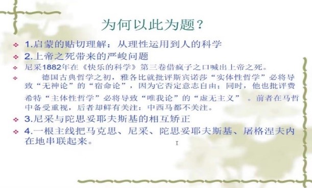 随后,刘教授援用卡夫卡讲过的雅各布教堂雇佣兵偷盗圣母玛利亚身上金饰品发生痉挛的故事引出“上帝之死”的概念:心中有上帝才会痉挛,心中上帝已死就不会了。对尼采1882年在《快乐的科学》中喊出的“上帝之死”,我们并不能仅从表面上理解,而应该关注其深层含义:上帝作为万能之神是人们借助传统形而上学思维方式塑造出来的,并为其提供合法性论证的。上帝之死不仅是指我们不再信奉这样的神灵,而是指它所代表和象征着的神圣、崇高的价值体系坍塌了、失效了,塑造和为之做出论证的传统形而上学思维方式也无效了,人们必须要转向一种新的思维方式和论证方式。