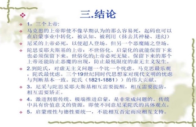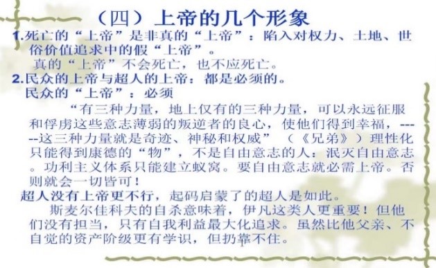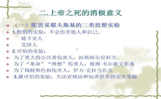 刘教授接着介绍陀思妥耶夫斯基从《地下室手记》《一个荒唐人的梦》《罪与罚》《群魔》《克拉马佐夫兄弟》等几部作品,陀思妥耶夫斯基的观点与尼采相反,认为“上帝之死”有消极的一面。首先是带来现代人生存的无根性,自然之根、人民之根乃至是精神之根都会因此而消逝,进而导致对传统、故国、自身归宿的背离;人们愈发的漂泊不定,精神虚无,以至于像荒唐人那样认为世界空无一物,完全逃避现实,企图在另一个世界追求自己的存在意义。其次,上帝之死带来的第二个消极后果是基本价值的坍塌,它变成所为崇高价值的坍塌更可怕更严重。这从《罪与罚》中的拉斯柯尔尼科夫为了公共善坑害老太太、《群魔》中彼得·韦尔霍文斯基为了受到恩格斯批评的所为“革命”坑害同伴、《克拉马佐夫兄弟》中的伊万为了金钱和美色坑害自己的父亲和兄弟越来越严重地体现出来。陀思妥耶夫斯基的探索表明,与其去谈论崇高的价值,不如去探讨道德的底线。对此,刘教授认为,尼采与陀思妥耶夫斯基对上帝有着非常不同的认识。对尼采来说,“上帝之死”让人类认识到了自身的价值,进而催生出了无限的可能性,让 “超人”的出现成为了可能。而陀思妥耶夫斯基则认为“上帝之死”会导致人们思想的虚无,同时还会导致最先看透这一点的“强者”,利用自己的能力或权力压迫弱者。