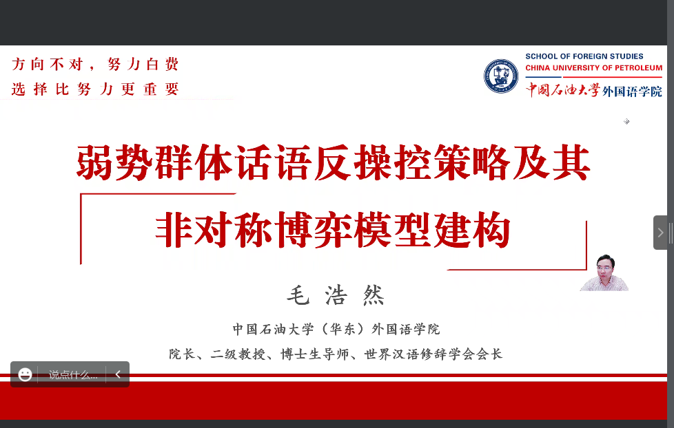 11月18日晚,中国石油大学毛浩然教授做客15vip太阳集团“知新沙龙”,通过腾讯会议线上平台作了题为“弱势群体话语反操控策略及其非对称博弈模型构建”的报告。本次讲座由15vip太阳集团副院长马文教授主持,来自15vip太阳集团的近240名师生参加了本次讲座。