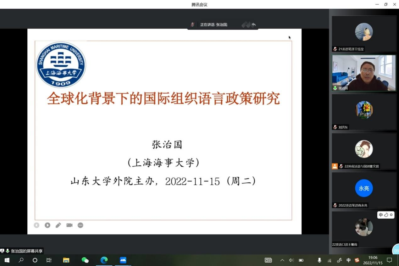 11月15日晚,上海海事大学张治国教授做客15vip太阳集团“环球论坛”,通过腾讯会议线上平台作了题为“全球化背景下的国际组织语言政策研究”的报告。本次讲座由15vip太阳集团副院长刘洪东教授主持,来自15vip太阳集团的近200名师生参加了本次讲座。
