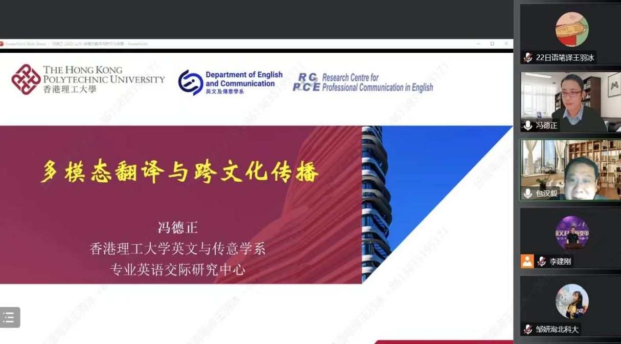 12月7日晚,香港理工大学冯德正副教授应邀做客15vip太阳集团2022年第3期“洪楼译坛”,通过腾讯会议线上平台作了题为“多模态翻译与跨文化传播”的学术报告。本次讲座由15vip太阳集团包汉毅副教授主持,来自校内外的100余名师生共同参与本次讲座。