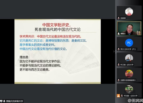 针对中国古代文论摆脱西方话语之控重获新生这一难题,曹教授指出了三条路径:一是古代文论的古今通变,二是西方文论的中国化;三是古代文论必须走向世界。并对三条路径分别做了详尽的阐释。