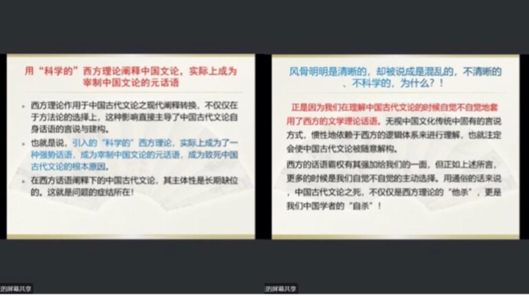 曹教授为此提出了一系列发人深思的问题,主要有:如何“阐释和转换”中国古代文论?什么是“科学的”理论?中国古代文论向死而生的历程是什么?中国古代文论如何获得新生?并就这些问题做了鞭辟入里的阐释。