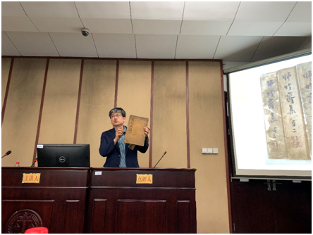 李成道首先对金荣镇教授的到来表示欢迎,并简要介绍了金荣镇教授的学术成就和研究成果。讲座围绕古朝鲜与中国明清时期文人之间的交流展开,金荣镇教授首先用地图展示了朝鲜文人在中国的使行交流路线,然后通过展示记录两国文人交流历史的书籍阐述了朝鲜与明清文人之间的交流情况。18世纪后期开始,古朝鲜与中国的学术交流上升至全新层面,当时学术交流的核心为互赠书籍与交换学术信息,这在中国与朝鲜半岛的交流史中具有重大意义。明朝时期,古朝鲜通过使臣往来向明朝赠予书籍,明朝使臣出访朝鲜后留下许多著作,例如董越的《朝鲜赋》及《皇华集》等,之后随着两国之间的交流的不断深入,更多的文学作品进入人们的视野。清朝时期,文人之间的交流以“北学派朴趾源”为转折点,呈现出与以往不同的发展态势,并更加深入,这一时期也产生了诸多文化著作。古代中国与朝鲜的交流中,书籍出版处于重要的地位。两国文人互相赠书也对两国的文化交流与发展起到了积极作用。接下来,金荣镇教授介绍了《燕行录》的有关内容,《燕行录》是指明清两朝期间来华的朝鲜使团有关人员将其在华时的所见所闻著录而成的书籍,现今《燕行录》的整理对于了解两国的文化交流过程具有十分重要的意义。