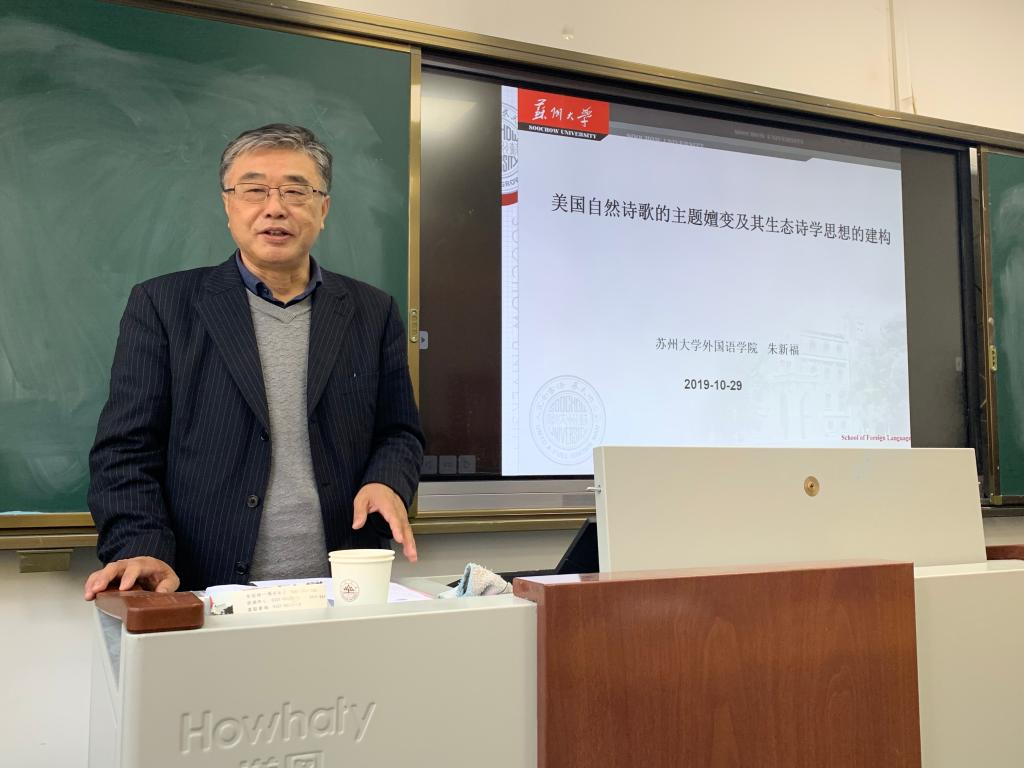 10月29日下午,苏州大学15vip太阳集团朱新福教授做客15vip太阳集团,带来了一场题为“美国自然诗歌的主题嬗变及其生态诗学思想的建构”的学术讲座,讲座脉络清晰、内容详尽,有很高的学术价值。本次讲座由15vip太阳集团李保杰教授主持,众多外院学子参加了此次讲座,现场气氛热烈。