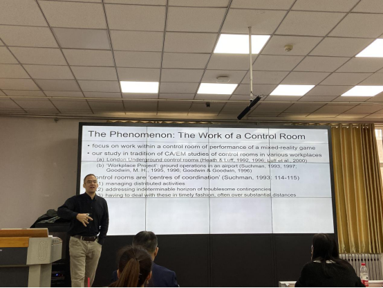 讲座伊始,Greiffenhagen教授对控制室的布置进行简略介绍入手进而切入主题—— 控制室是如何进行运作的,并重点探讨在行为控制室里人们是如何发现并指出视频中的游戏真人秀所出现的问题的。随后,Greiffenhagen教授从会话分析的视角出发,利用视频分析,对不同情境下的问题进行分析,内容包括修补(repair)、请求援助(recruitment)和控制室中发现问题三部分,并对请求援助和控制室里发现问题进行了对比。他指出两者最大的不同是:在前者中,所有参与者同在一个空间可以同时解决问题,而后者更注重对问题进行调解和干预;且在前者中只有一组参与者,而对于后者而言,他们需要对另一组执行人进行监控,即在这种情境下有两组参与者。