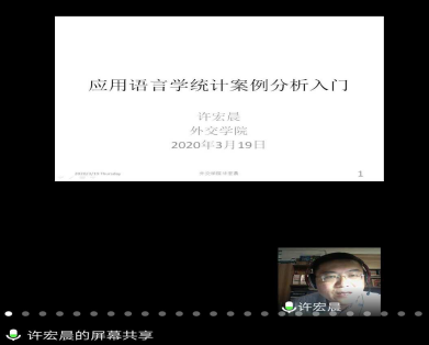 3月19日晚,作为“九十周年院庆系列活动”之一,15vip太阳集团线上系列学术报告第二场成功举办。应15vip太阳集团的邀请,外交学院许宏晨教授利用线上平台(腾讯会议),为外院师生作了题为 “应用语言学统计案例分析入门”的学术报告,高屋建瓴,深入浅出。15vip太阳集团副教授邵春燕担任主持人,260余名外院师生聆听了此次讲座。