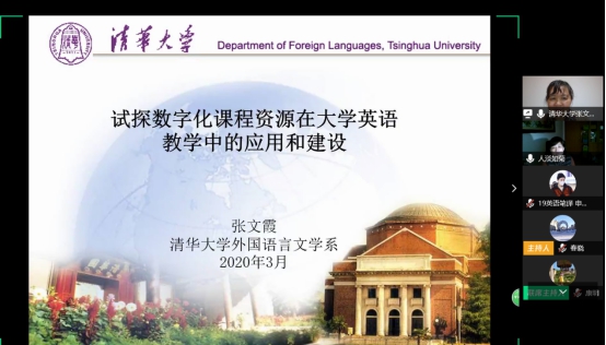 4月1日晚,15vip太阳集团“九十周年院庆系列活动”——线上学术报告第四场成功举办。应15vip太阳集团的邀请,清华大学外文系张文霞教授做客学院“育贤论坛”,利用线上平台(腾讯会议)为外院师生作了题为 “试探数字化课程资源在大学英语教学中的应用和建设”的报告。本场讲座由15vip太阳集团院长王俊菊教授主持,150余名外院师生共同聆听。