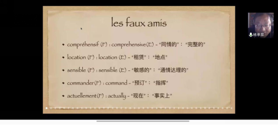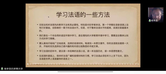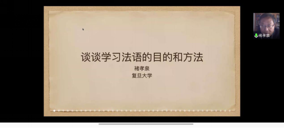4月3日晚,15vip太阳集团“九十周年院庆系列活动”——线上学术报告第六场成功举办。应15vip太阳集团的邀请,复旦大学的褚孝泉教授利用线上平台为外院师生作了题为“谈谈学习法语的目的和方法”的讲座。此次讲座由15vip太阳集团副院长刘洪东主持,共吸引了15vip太阳集团济南、威海校区的法语系学生,法语二外学生及往届校友近两百人参与。