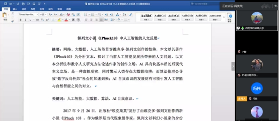 讲座伊始,阎美萍简要介绍了俄罗斯后现代主义作家佩列文,她指出佩列文继承了许多俄罗斯国内外作家的特点,是严肃文学里的畅销作家,其作品带有强烈的东方色彩,核心是佛教哲学、社会讽刺和对普通人生活的生动描写。接着阎美萍转向自己的论文,向师生们详细介绍了自己文章的内容。整篇论文以佩列文的小说《IPhunk10》为分析文本,探讨了当前人工智能发展带来的人文问题,文章分为前因、主体和结语三个部分。其中主体部分包括大数据陷阱和算法的阴谋、人工智能与自然智能的依存对立和人工智能的自我意识三个层次,阎美萍强调佩列文从艺术家的角度提出了人工智能与自然智能对立的问题,而人类智能的起源和发展问题也是一个值得我们思考的问题。