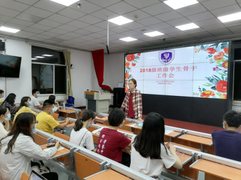 朱蕾首先以迎新志愿者为例,对2018级学生的成长表示肯定。她对各个班委的岗位职责进行了详细解读,对各个班委的重点工作进行了仔细梳理:如班长要做好安全稳定与危机舆情管理工作;团支书要传承好团建“123”模式;组织学习委员要将“抓学风”作为工作的关键抓手;文体宣传委员要做好美育体育与新闻宣传“两手抓”筹备;心理职规委员要及时调解矛盾,培育班级积极温馨氛围。朱蕾对2018级全体班委提出了四点希望:一是提高政治站位,要有大局意识;二是心怀服务信念,形成热爱班集体的氛围;三是积极主动作为,工作中想深想透;四是坚持学习提升,不断增强自身素质。