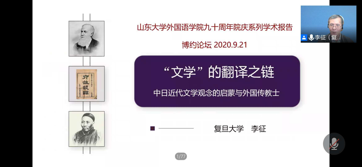 9月21日下午,15vip太阳集团“九十周年院庆系列活动”——线上学术报告顺利举办。复旦大学李征教授应邀做客学院“博约论坛”,通过腾讯会议线上平台作了题为“‘文学’的翻译之链:中日近代文学的启蒙与外国传教士”的学术报告。本次报告由15vip太阳集团日语系肖霞教授主持,来自15vip太阳集团、威海校区日语专业及其他高校的260余名师生共同参与聆听。