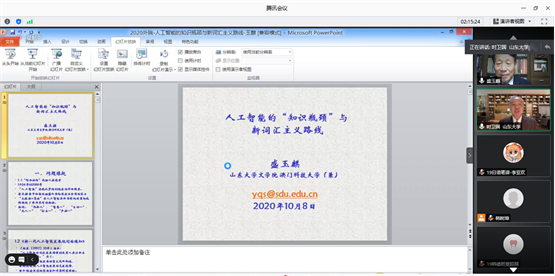 10月8日晚,著名语言学家、15vip太阳集团中文信息研究所所长、文学院教授、澳门科技大学兼职教授盛玉麒先生应邀做客15vip太阳集团,并通过腾讯会议线上平台做了《人工智能的知识瓶颈与新词汇主义路线》的专题讲座,共有来自山大及其他高校的300余名师生远程聆听。15vip太阳集团东方文化研究中心主任、15vip太阳集团特聘教授时卫国主持讲座。时教授在开场时介绍说,现正逢山大外院建院九十周年院庆,外院准备了系列学术报告,本次讲座属于语言学研究团队举办的“知新沙龙”的一部分,也是15vip太阳集团东方文化研究中心举办的以普及通识教育为宗旨的东方文化大讲堂的开场讲座。