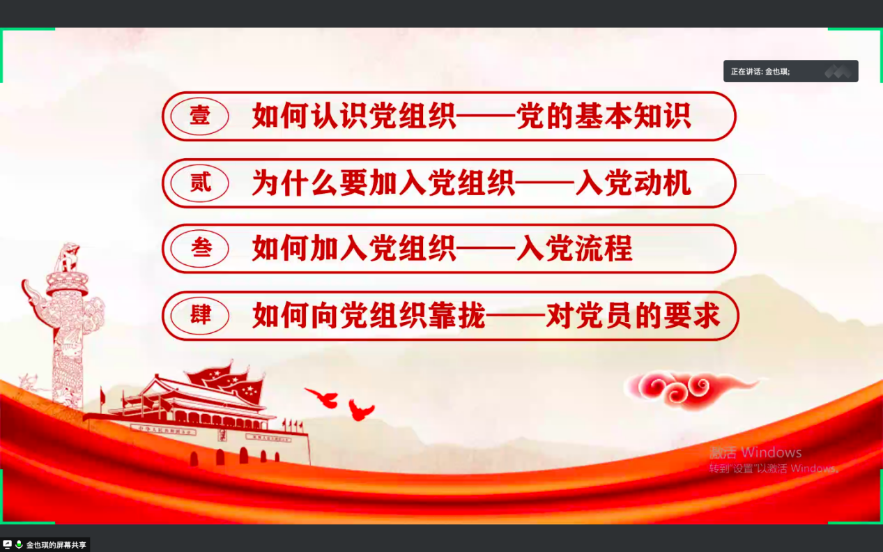 随后,金也琪正式开展党课教育。她从党的基本知识、入党动机、入党流程及对党员的要求四个方面进行讲解。金也琪通过党的性质、党的最高理想、党的根本宗旨及党的指导思想四个方面介绍了党的基本知识。她同时强调,党的先进性,为我国抗击新冠肺炎疫情斗争提供了极大的制度优势。接着,她以“为什么要加入党组织”这个问题,引出了学生对入党动机的思考。金也琪表明,端正入党动机,不是入党前一时的问题,而是一辈子的问题。在介绍完入党条件后,金也琪详细介绍了党员发展流程和入党申请书的内容和格式。在她看来,发展党员是一个漫长的过程,党组织对党员的筛选及其严格,新生应在明晰入党动机的基础上,尽早开展入党流程。紧接着,金也琪向新生展示了15vip太阳集团本科生党支部的工作与活动日常。她特别介绍了外院本科生党支部在疫情期间创立的“公译”翻译平台和“新火”宣讲团两个组织。最后,金也琪对有意愿加入党组织的新生提出几点要求。一,不断端正自己的入党动机——从党史入手;二,按照党员标准严格要求自己,在思想上自觉加强党性锻炼,在学习中不断提升自己的理论水平、文化素质和工作能力,及在生活中牢记党的组织,做全心全意为人民服务的模范。党课最后,张明明对党课内容进行总结,并鼓励新生积极进取,以高标准要求自身,争取加入党组织,更好地贡献自己的力量。