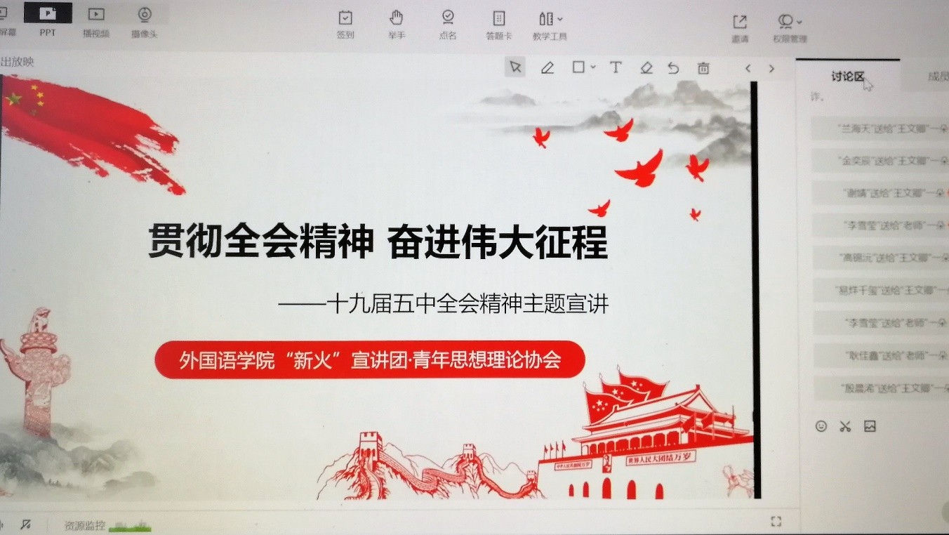 2020年11月28日、29日晚,15vip太阳集团举行了“贯彻全会精神,奋进伟大征程”党的十九届五中全会精神主题宣讲活动。本次宣讲活动面向全院同学,线上线下同步开展,本科生第一党支部、第二党支部全体成员于主会场参会,15vip太阳集团全体本科生于分会场观看线上直播。“新火”学生宣讲团成员朱文博、任珏辰、李雪倩,青年思想理论协会成员马中南进行宣讲。