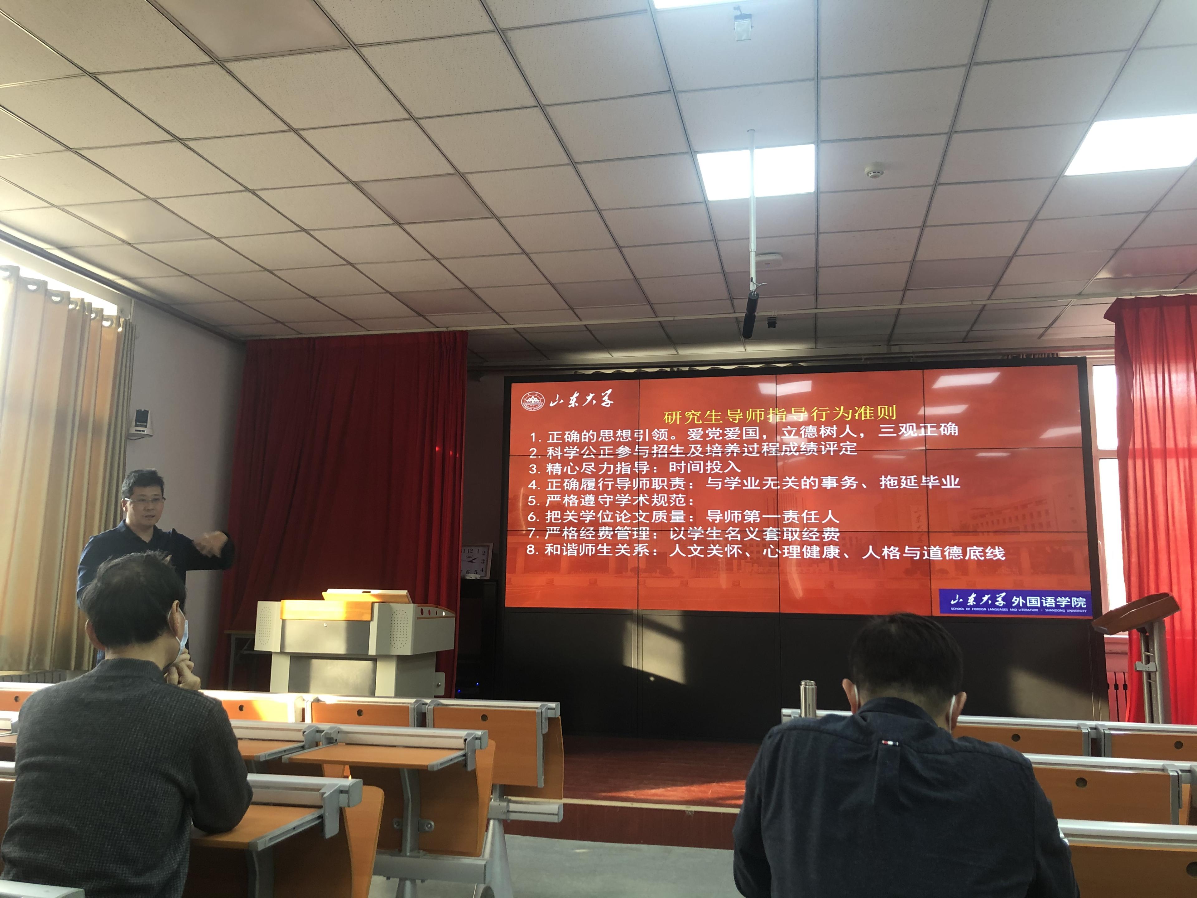 随后,李建刚副院长具体传达了专业学位水平评估工作的精神和要求,对评估工作做出了具体安排;对《教育部 国家发展改革委 财政部关于加快新时代研究生教育改革发展的意见》和《教育部关于印发〈研究生导师指导行为准则〉的通知》政策文件做了重点解读,从健全三全育人机制、发挥导师言传身教作用、强化产教融合育人机制、加强学分建设、严惩学术不端行为、导师队伍存在的问题等方面做了重要强调。会议最后,李建刚副院长对全体导师对各项工作的支持和配合表示了感谢。