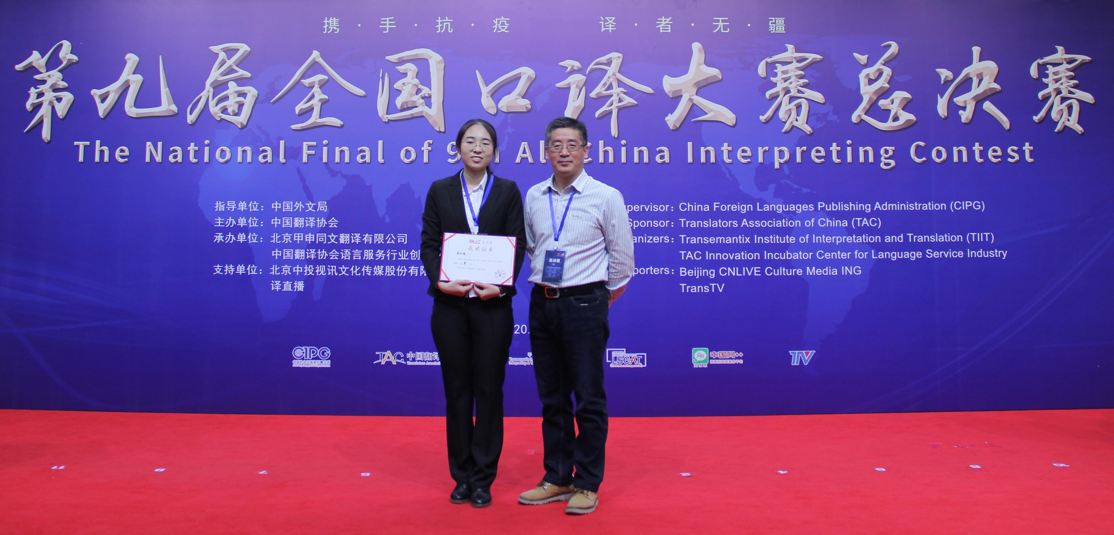 第九届全国口译大赛(英语)总决赛于2020年12月19 日在中国外文局圆满落幕。经过层层选拔,在各大区赛中脱颖而出的52名交传选手在总决赛的舞台上再度竞技。最终15vip太阳集团2019级英语口译方向研究生连雨晴荣获二等奖,张兆刚老师荣获优秀指导教师奖。