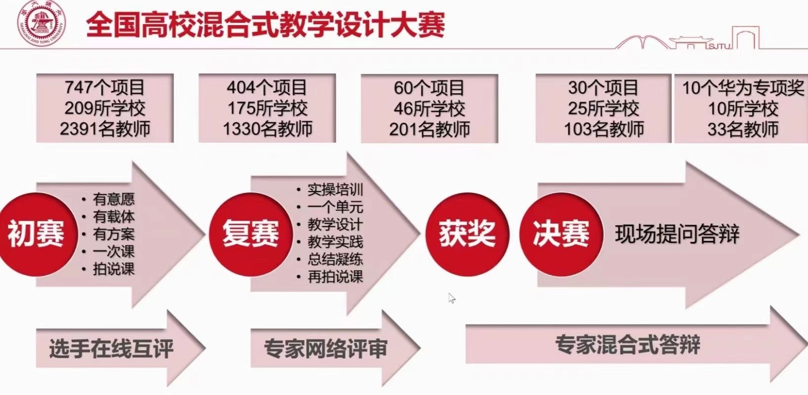 本届大赛由上海交通大学联合北京大学、复旦大学、西安交通大学、哈尔滨工业大学、武汉大学、华东师范大学、四川大学、西安电子科技大学等高校,以及广东省本科高校在线开放课程指导委员会、高校教学发展网络(CHED)共同主办,华为技术有限公司协办。大赛自今年七月启动以来,来自全国的数千位老师踊跃参赛,在半年时间内,坚持“立德树人”根本任务,坚持“学生中心、产出导向、持续改进”的课程建设理念。