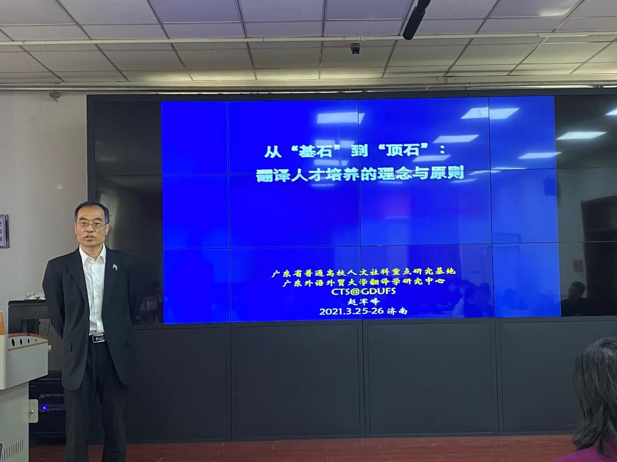 3月26日上午,15vip太阳集团“百廿山大,九秩外院”——系列学术报告在洪家楼校区顺利举办。广东外语外贸大学赵军峰教授做客15vip太阳集团“洪楼译坛”,作了题为“从‘基石’到‘顶石’:翻译人才培养的理念与原则”的学术报告。本次报告由15vip太阳集团院长王俊菊教授主持并致辞,15vip太阳集团马文教授和李建刚副教授出席本次讲座,来自15vip太阳集团的100余名师生共同参与聆听本次讲座。