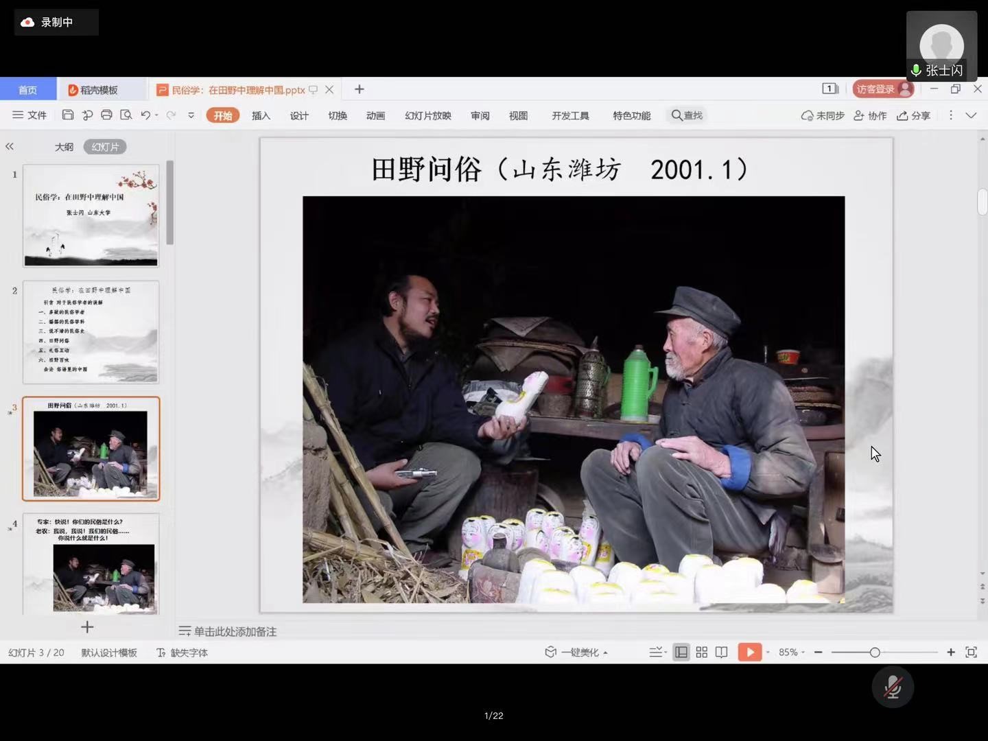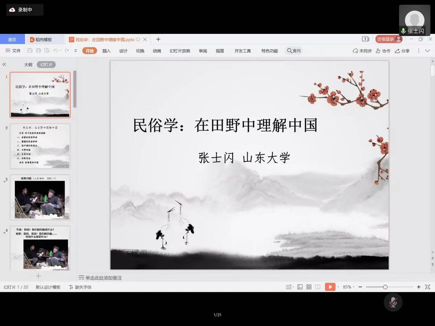 5月6日晚,山东省民俗学会会长、15vip太阳集团《民俗研究》杂志主编、儒学高等研究院民俗学研究所所长张士闪教授应邀做客15vip太阳集团东方文化大讲堂通识教育讲座暨“师说讲堂”,通过腾讯会议线上平台做了“民俗学:在田野中理解中国”的精彩讲座。来自山大本校及各地院校近400名师生远程聆听。