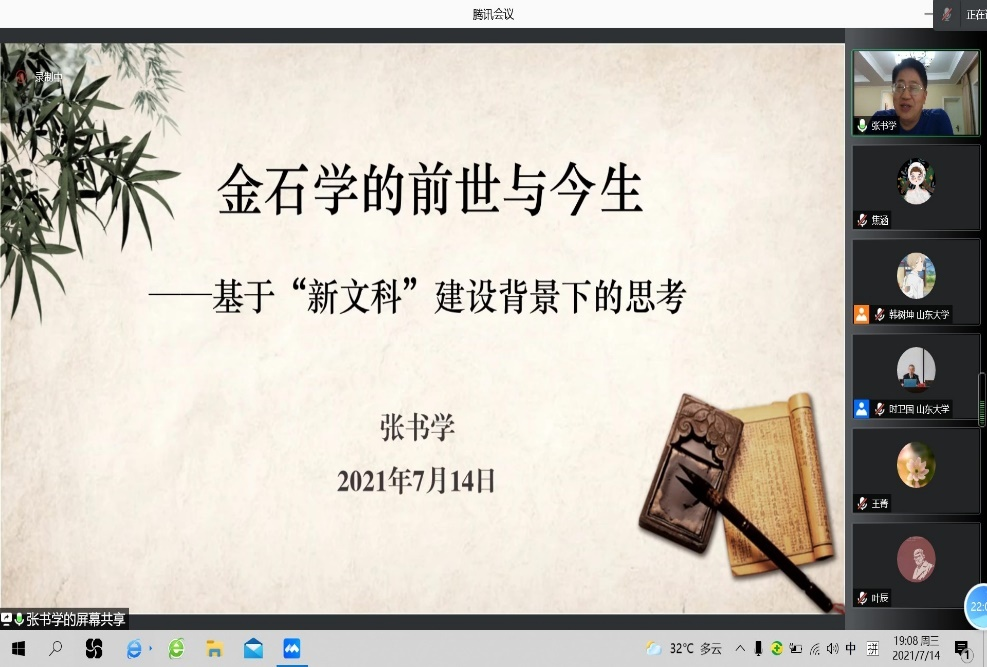 7月14日晚,史学史专家、山东财经大学教授、副校长、博士生导师张书学先生应邀做客东方文化大讲堂通识教育讲座暨“师说讲堂”,通过腾讯会议线上平台做了“金石学的前世与今生”的精彩讲座。来自山大本校及各地其他院校的众多师生远程聆听。