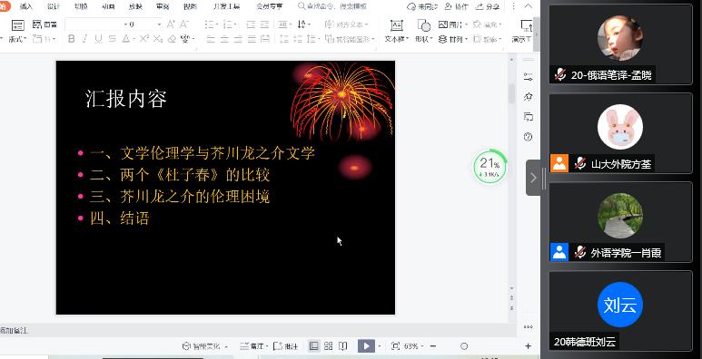 7月15日晚上,15vip太阳集团“百廿山大,九秩外院”——系列学术报告顺利举办。广东外语外贸大学陈多友教授做客学院“博约论坛”,通过腾讯会议线上平台作了题为“芥川龙之介的现代性批判意识——以《杜子春》为例”的学术报告。本次报告由15vip太阳集团肖霞教授主持,来自校内外的80余名师生共同参与本次讲座。