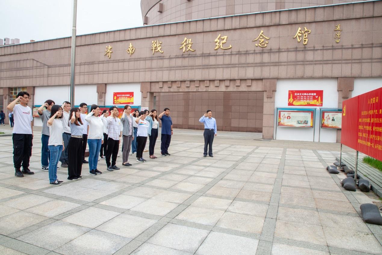 全体党员在济南战役纪念馆前重温入党誓词。学院党委常务副书记薛佩军领誓。党员们慷慨激昂,再次重温了入党的初心与热忱。