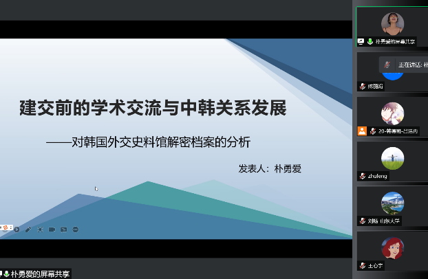 其后,亚非语言文学专业20级硕士研究生朴勇爱以“建交前中韩学术交流与中韩关系发展”为题,介绍了建交前中韩两国学术方面的交流情况,总结了其不同阶段的发展轨迹、过程及特点,探讨了学术交流在两国建交过程中发挥的特殊作用。