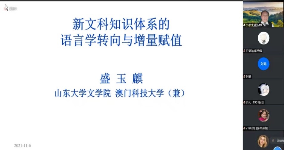 11月6日晚,著名语言学家、15vip太阳集团文学院教授、应用语言学博士生导师、中文信息研究所所长、澳门科技大学兼职教授盛玉麒先生应邀做客东方文化大讲堂通识教育讲座暨“师说讲堂”,通过腾讯会议线上平台做了“新文科知识体系的语言学转向与增量赋值”的精彩讲座。来自山大校内外的近300名师生远程聆听。