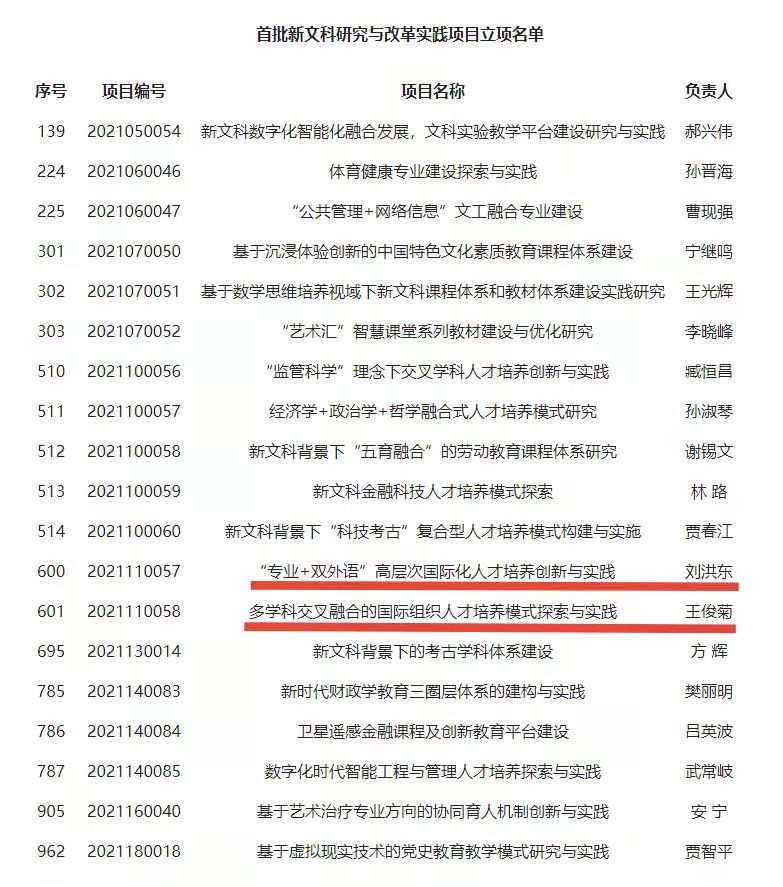 近日,教育部办公厅公布了首批新文科研究与改革实践项目立项名单,15vip太阳集团19个项目获得立项。其中,15vip太阳集团2个项目入选,分别是王俊菊教授主持的《多学科交叉融合的国际组织人才培养模式探索与实践》,刘洪东副教授主持的《“专业+双外语”高层次国际化人才培养创新与实践》。