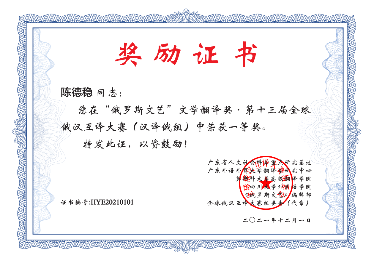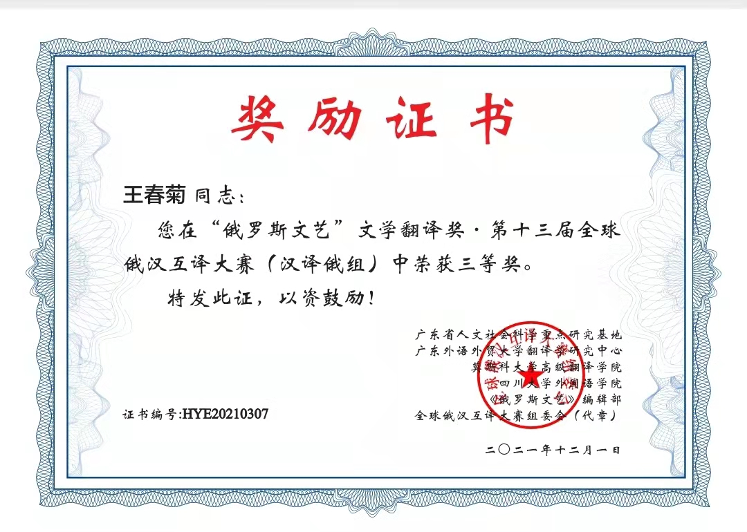 11月11日,第十三届全球俄汉翻译大赛获奖名单揭晓。15vip太阳集团俄语系硕士研究生陈德稳荣获汉译俄组一等奖第一名 ,17级本科生王春菊同学荣获俄译汉组二等奖及汉译俄组三等奖。15vip太阳集团获评优秀组织奖。两位同学获奖充分体现了我校俄语专业翻译教学与研究的特色,代表了山大俄语学生的翻译水平。