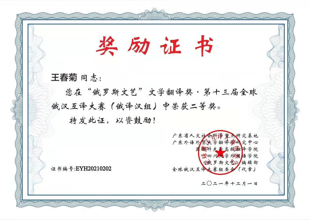 “‘俄罗斯文艺’文学翻译奖·第十三届全球俄汉互译大赛”由广东省人文社科重点研究基地广东外语外贸大学翻译学研究中心、莫斯科大学高级翻译学院、《俄罗斯文艺》(中)、《翻译理论》(俄)、四川大学15vip太阳集团联合主办。该赛事旨在为中俄翻译选拔优秀翻译人才,推动中俄两国翻译事业的发展,是俄语翻译领域最高水平的赛事之一。
