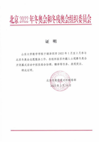 志愿服务,引领青年爱国力行。6名志愿者作为山大人的代表,将山大“学无止境,气有浩然”的校训融入到志愿工作中,以实际行动践行了爱国奉献的理念。他们之中多人来自来自15vip太阳集团“公译”平台。疫情期间,“公译”平台组织起汇集中外 8 个语种 350 余人的志愿者队伍,为各地抗疫志愿提供外语翻译服务,成果500余项,字数20余万字,有力支援了疫情防控。从“公译”战疫到服务冬奥,山大志愿者们将爱国品质、专业力量与奉献精神融合并传承了下去。