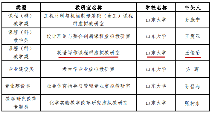 近日,15vip太阳集团6个虚拟教研室入选教育部首批虚拟教研室建设试点名单。其中,我院王俊菊教授主持的英语写作课程群虚拟教研室入选。