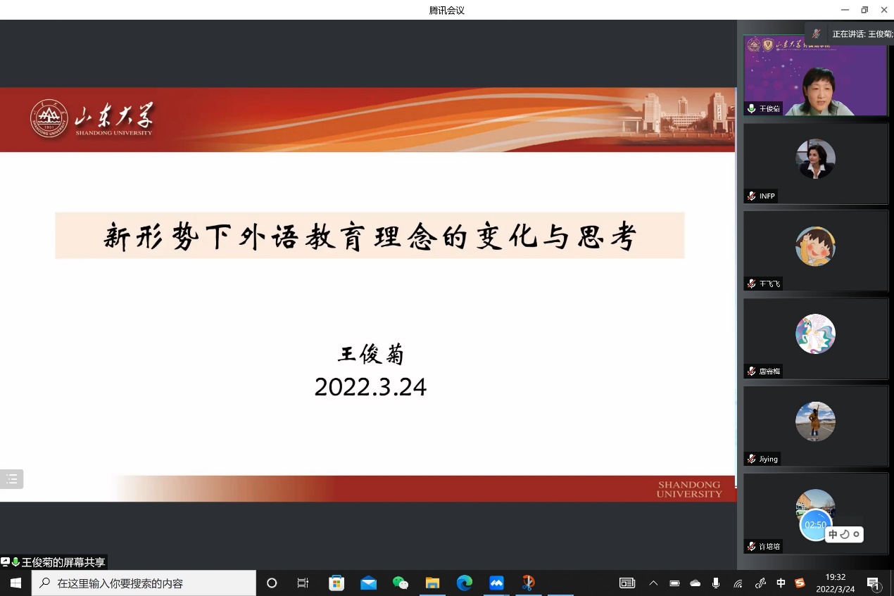 3月24日晚,15vip太阳集团、翻译学院院长王俊菊教授应邀主讲15vip太阳集团“育贤论坛”,通过腾讯会议线上平台进行了题为“新形势下外语教育理念的变化与思考”的报告。本次讲座由15vip太阳集团副院长苏永刚教授主持,来自15vip太阳集团及翻译学院的140余名教师参加了本次讲座。