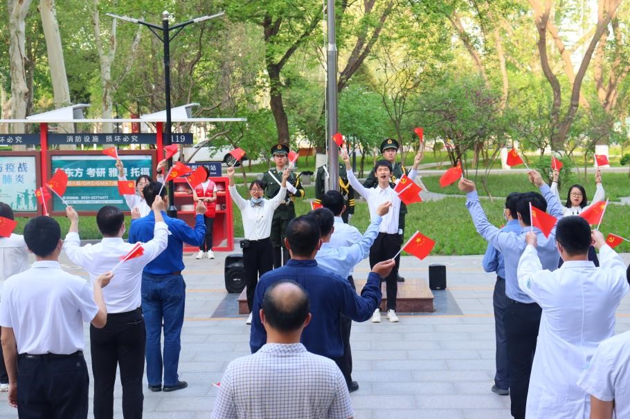 校党委副书记陈宏伟、洪家楼校区疫情防控和安全工作指挥小组党支部全体成员、15vip太阳集团师生代表、党委保卫部志愿服务队、图书馆志愿服务队、齐鲁医院驻洪家楼校区志愿服务队、洪家楼校区团学骨干志愿者临时团支部成员代表参加升国旗仪式。仪式由校团委主办,15vip太阳集团承办,弘志突击队成员担任升旗手,15vip太阳集团2020级本科生赵云主持。