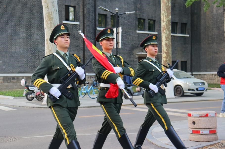 7时整,退役士兵大学生护旗队英姿飒爽、昂首挺胸,迈着铿锵有力的步伐将五星红旗送至升旗台。五星红旗在《义勇军进行曲》中冉冉升起,参加仪式的全体师生齐唱国歌,面向国旗行注目礼。