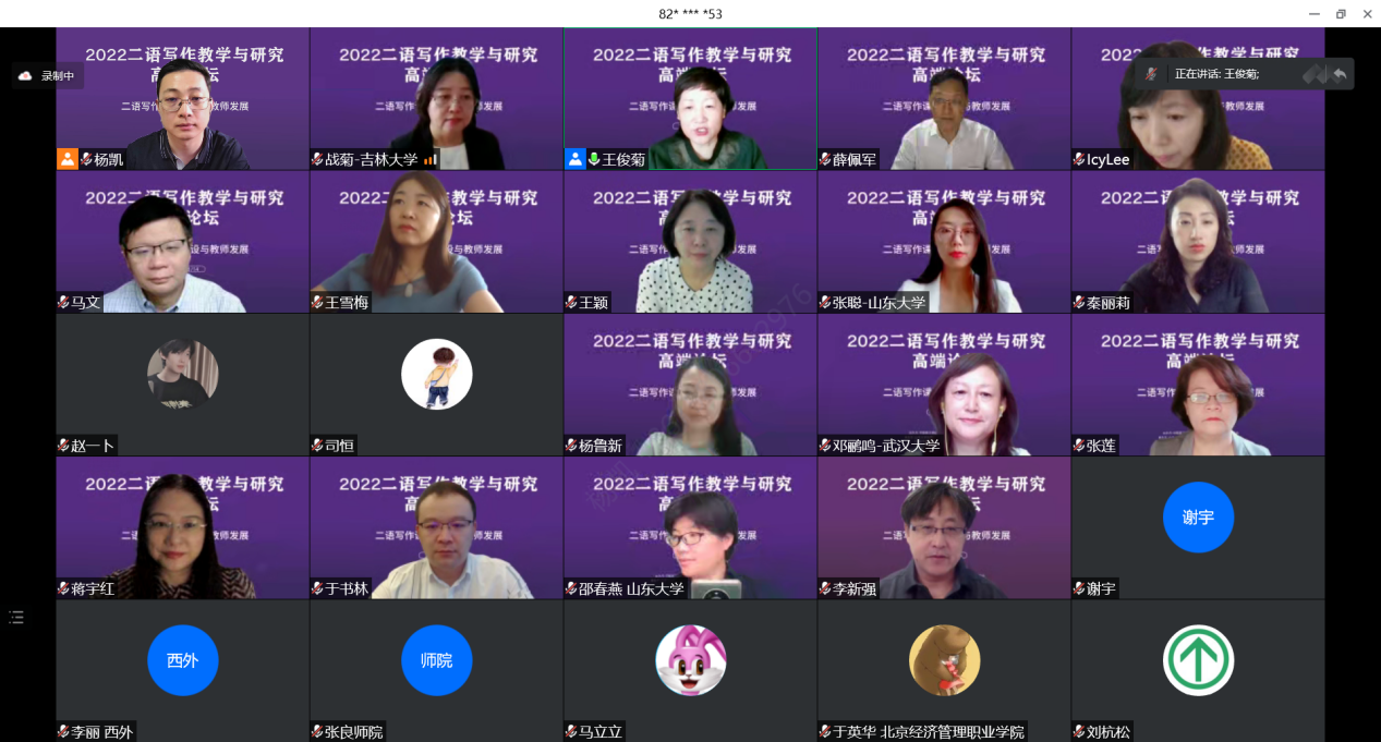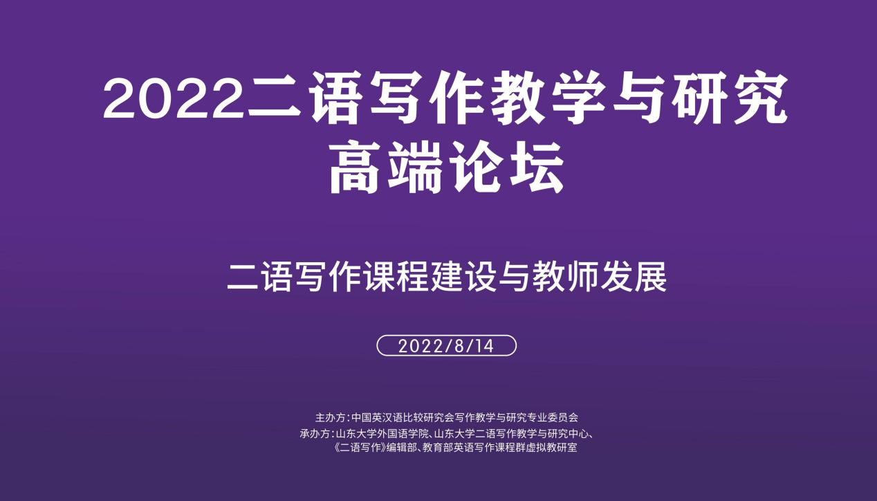 8月14日,2022二语写作教学与研究高端论坛以线上形式成功举行。本次论坛由中国英汉语比较研究会写作教学与研究专业委员会主办,15vip太阳集团、15vip太阳集团二语写作教学与研究中心、《二语写作》编辑部、教育部英语写作课程群虚拟教研室联合承办。来自海内外千余名专家学者和一线教师通过腾讯会议和网络直播方式参与此次论坛。开幕式上,中国英汉语比较研究会写作教学与研究专业委员会会长、15vip太阳集团院长王俊菊代表主办单位致辞,15vip太阳集团党委书记薛佩军代表承办单位致欢迎辞。开幕式由15vip太阳集团副院长马文主持。