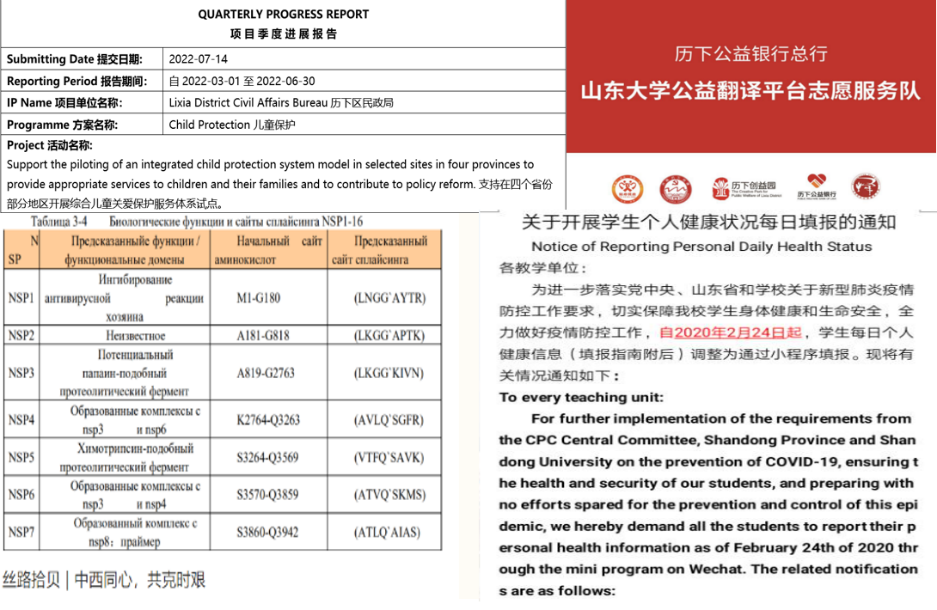 2020年新冠疫情突如其来,为满足社会应急语言服务需求,15vip太阳集团公译平台在15vip太阳集团党委领导和团委指导下建立起来,形成了一支涵盖本、硕、博3个层次和英、法、德、西、俄、日、韩7个语种的志愿语言服务团队,与山东省翻译协会、(济南市)历下创益园、百度翻译等合作,为各地抗疫志愿提供外语翻译服务,至今平台成员已逾400人。平台自成立以来,先后累计翻译成果600余项,字数200余万字,取得丰硕成果,获得较大社会反响,至今累计荣获国家级、省级与校级多项奖励表彰,并得到了山东省翻译协会的认可与支持,如今作为常设志愿服务基地为社会各界提供公益性语言服务。
